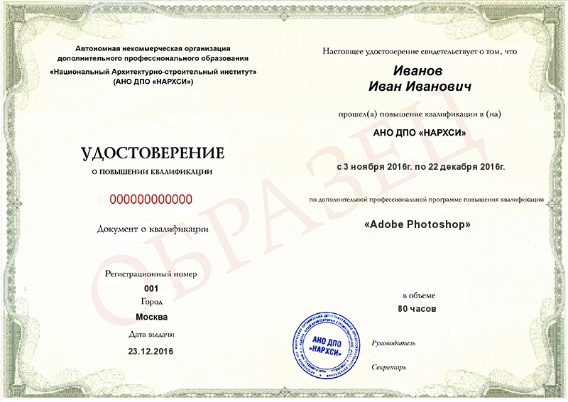 - Образец удостоверения о повышении квалификации.